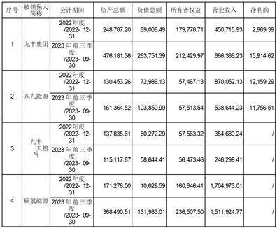 ● 被担保人名称:广东九丰能源集团有限公司(以下简称“九丰集团”)、东莞市九丰能源有限公司(以下简称“东九能源”)、东莞市九丰天然气储运有限公司(以下简称“九丰天然气”)、新加坡碳氢能源私人有限公司(以下简称“碳氢能源”),均为江西九丰能源股份有限公司(以下简称“公司”“上市公司”或“九丰能源”)合并报表范围内子公司。