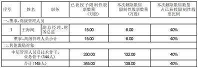 除1名激励对象因个人原因离职不符合激励对象条件外(公司将对其所持有的已获授但尚未解除限售的限制性股票40,000股进行回购注销),本次符合限制性股票解除限售条件的激励对象为145名,解除限售数量为138.00万股,占已获授限制性股票的比例为40%。