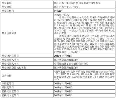 鹏华永鑫一年定期开放债券型证券投资基金(以下简称“本基金”) 自2023年11月02日起(含当日)进入开放期,其中开放申购时间为2023年11月02日至11月29日,在此期间接受投资者的申购和转换转入业务申请;开放赎回时间为2023年11月02日至11月28日,在此期间接受投资者的赎回和转换转出业务申请。