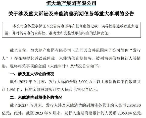 根据公告,涉及重大诉讼方面,截至2023年9月末,恒大地产标的金额3000万元以上未决诉讼案件数量共计1961件,标的金额总额累计约4534.17亿元。在资产处置方面,截至2023年9月末,恒大地产通过股权转让、土地及在建工程转让、信托、代持等方式,已完成过户的房地产项目共计75个。