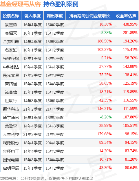 毛从容管理的景顺长城安享回报混合A基金在16年1季度买入景嘉微,在持有1个季度后在16年2季度卖出。持有期间的估算收益率为438.95%,持有期间景嘉微在2015年到2016年的年报归属净利润增幅达18.36%。