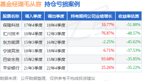 毛从容管理的景顺长城景颐丰利债券A基金在17年4季度买入保隆科技,在持有1年又0个季度后在18年4季度卖出。持有期间的估算收益率为-51.8%,持有期间保隆科技在2017年到2018年的年报营业总收入增幅达10.77%。