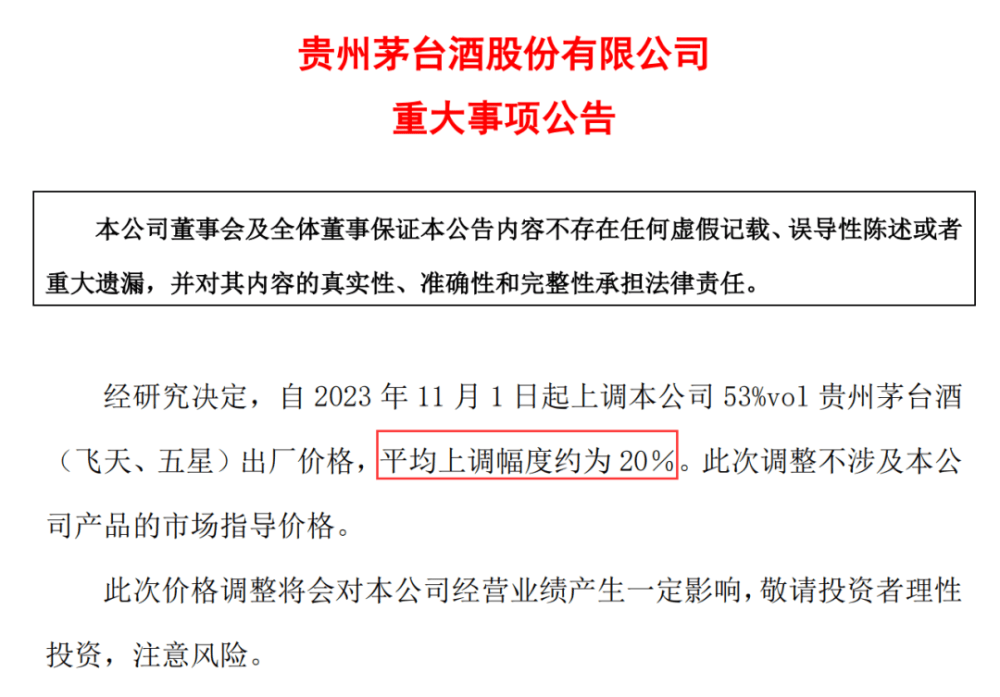 贵州茅台发布公告称,经研究决定,自2023年11月1日起上调本公司53%vol贵州茅台酒(飞天、五星)出厂价格,平均上调幅度约为20%。此次调整不涉及本公司产品的市场指导价格。值得一提的是,茅台此次涨价从公告到实施,只隔了短短十来分钟。
