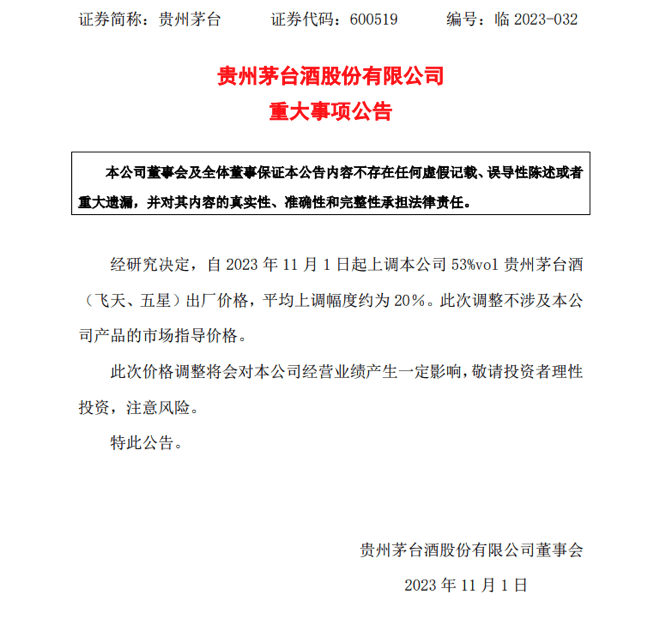 财联社10月31日电,贵州茅台发布公告,经研究决定,自2023年11月1日起上调本公司53%vol贵州茅台酒(飞天、五星)出厂价格,平均上调幅度约为20%。