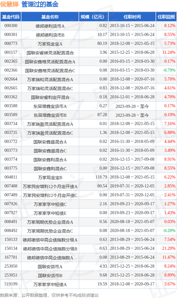 侯慧娣女士:理学硕士,约翰霍普金斯大学博士生肄业。2006年7月至2008年10月在世商软件(上海)有限公司任研发部债券分析师,从事债券投资组合风险量化分析、利率互换定价研究、债券估值定价分析工具研究;2009年12月至2012年9月在国信证券股份有限公司经济研究所任债券分析师,从事债券基金资产配置与归因分析、固定收益产品发展研究、可转债投资策略研究;2012年9月至2015年6月在德邦基金管理有限公司工作,先后担任高级债券研究员、基金经理、固定收益部副总监等职;2015年6月至2018年6月在国联安基金管理有限公司工作,担任固定收益部基金经理;2018年6月进入万家基金管理有限公司工作。曾任万家民安增利12个月定期开放债券型证券投资基金的基金经理、万家瑞和灵活配置混合型证券投资基金、万家瑞盈灵活配置混合型证券投资基金、万家家丰中短债债券型证券投资基金、万家家享中短债债券型证券投资基金基金经理。曾任万家现金宝货币市场证券投资基金基金经理。2023年9月28日起担任东吴增鑫宝货币市场基金基金经理。