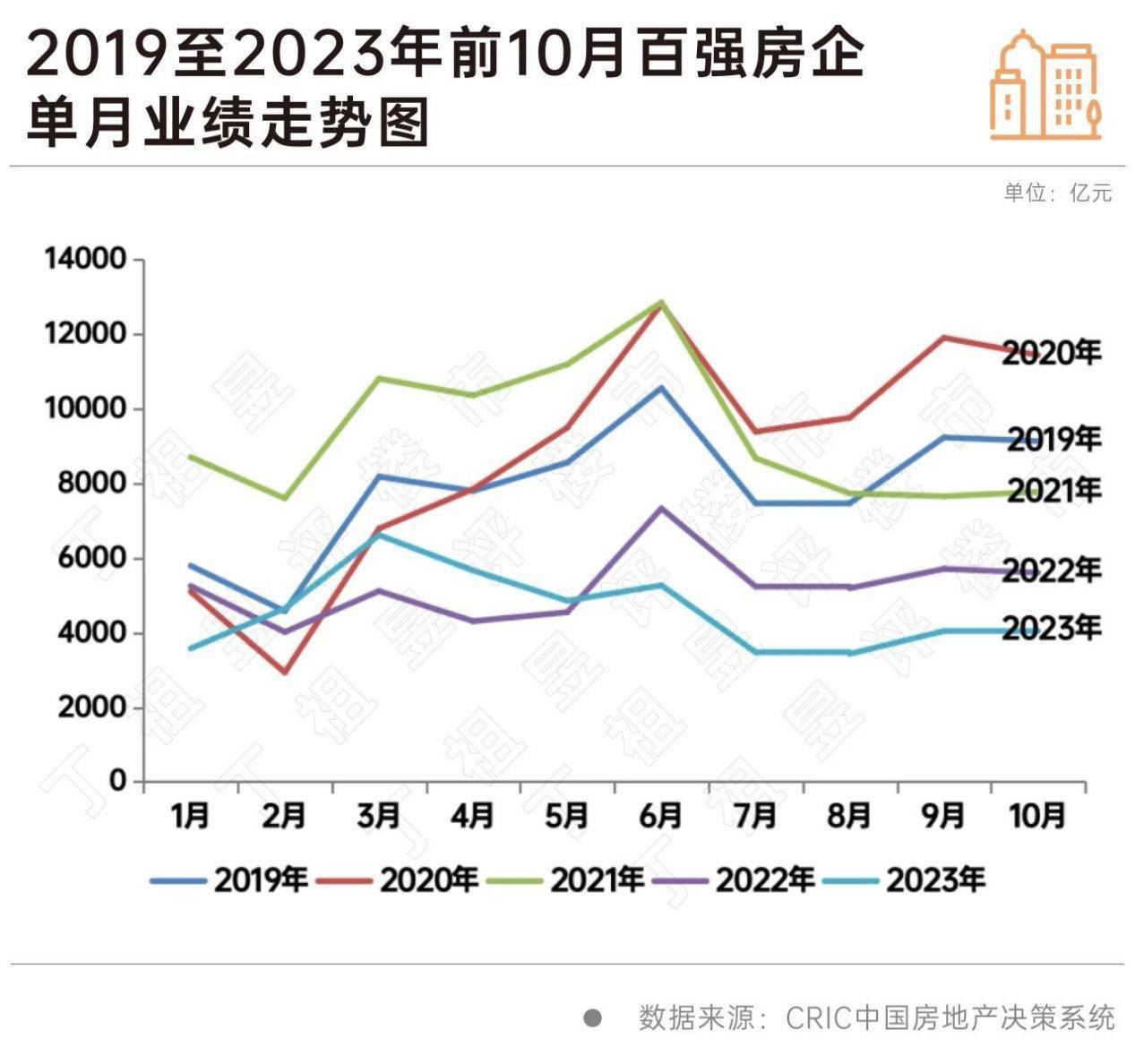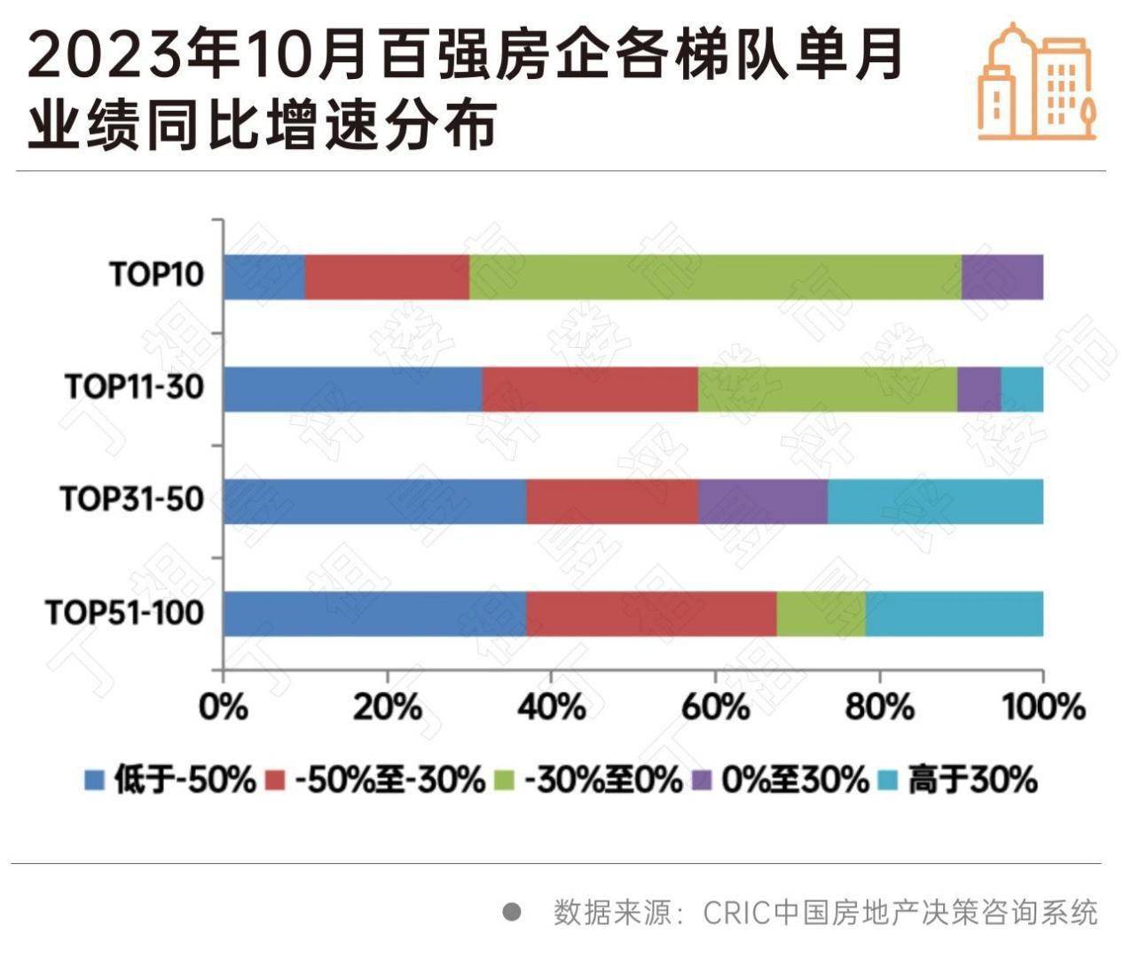 从企业表现来看,2023年10月近六成百强房企单月业绩环比降低,近半数百强房企同环比双降。具体来看,10月有20家百强房企的单月业绩环比降幅大于30%,40家的环比降幅在0-30%之间。