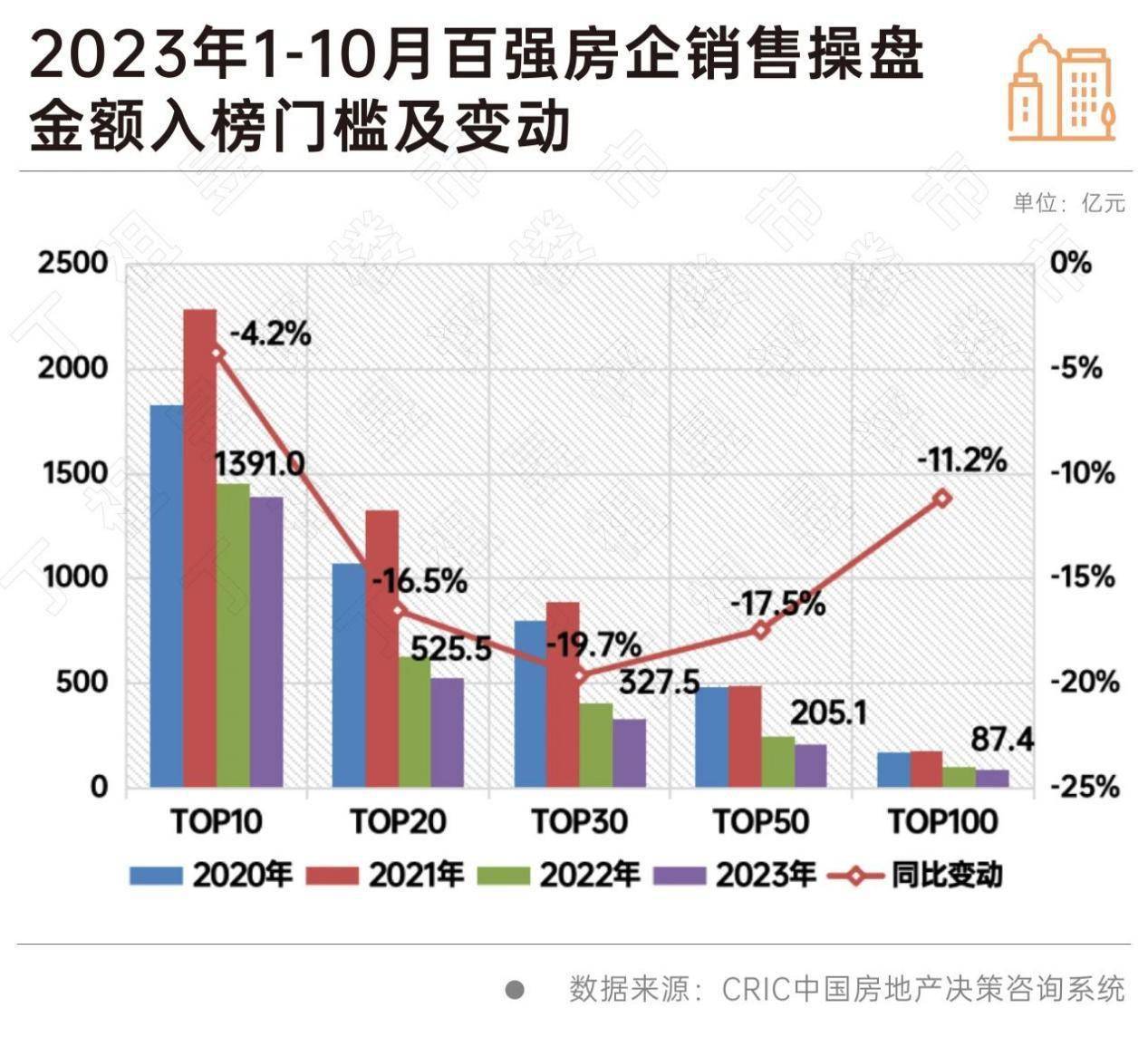 TOP100房企的销售操盘金额门槛则较去年同期降低11.2%至87.4亿元。
