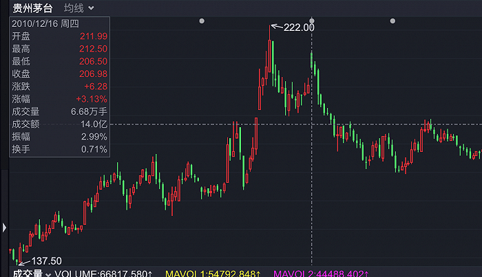 2010年12月16日公告显示,贵州茅台决定自2011年1月1日起适当上调产品出厂价格,平均上调幅度为20%左右。结果2010年12月16日,贵州茅台同样大涨,涨幅为3.13%(不复权)。