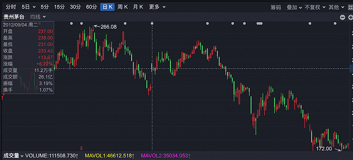 2012年9月4日当天贵州茅台的股价涨幅为6.22%(不复权)。