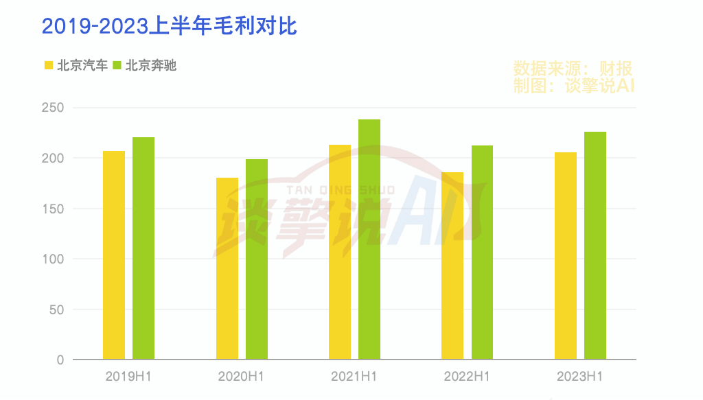 更加值得注意的则是毛利,根据财报,北京汽车2019-2023年的上半年毛利分别为:206.58亿、180.3亿、213.25亿、185.6亿和205.66亿元;而同期北京奔驰的毛利分别为:220.24亿、198.65亿、238.21亿、212.13亿和226.15亿元。