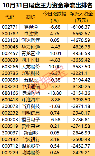 数据宝统计,15股尾盘主力资金净流出超2000万元;真视通、卓胜微、润达医疗、华力创通等尾盘净流出金额居前。
