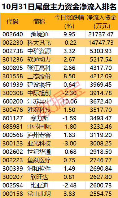 14股尾盘主力资金净流入金额超3000万元。两股尾盘亮了,跨境通、科大讯飞尾盘主力资金净流入均亿元,居前。