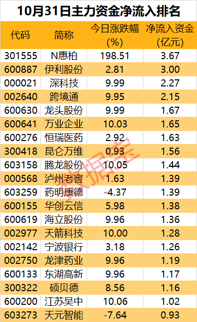 新股N惠柏今日正式登陆创业板,首发价22.88元/股,发行市盈率33.63倍,盘中一度涨超260%,收盘涨198.51%;主力资金净流入3.67亿元,居首。