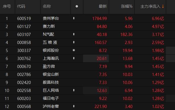 原标题:12只A股主力资金净流入超1亿元 贵州茅台达近7亿元居首