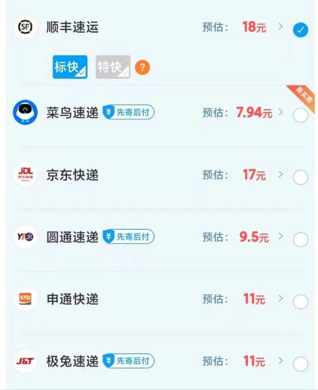 菜鸟速递与顺丰、京东快递的预估快递费对比