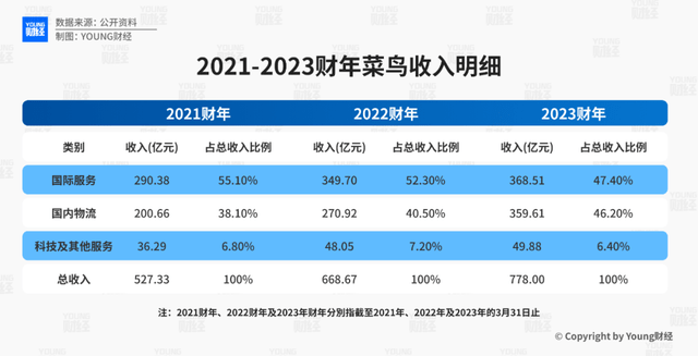 在财务报表层面,菜鸟主要以地域划分业务类别,招股书显示,公司的收入主要分为国际物流服务收入(包括跨境快递、国际供应链及少量海外本地物流服务)和国内物流服务(包括国内供应链及国内品质快递服务);而通过菜鸟驿站、APP产生的服务费、广告费,以及物流设施租赁和管理费用等则被归入到“科技及其他服务收入”一项。截至2023年财年末,菜鸟的国际物流服务收入、国内物流服务收入及科技及其他服务收入占比分别为47.4%、46.2%、6.4%。