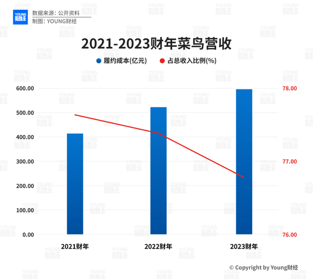 而导致菜鸟长期亏损的主要原因是履约成本高昂。履约成本包括仓储、运输、配送等环节的费用,由于近些年菜鸟业务规模持续扩大,叠加地缘政治等因素影响,公司履约成本居高不下:2021-2023财年,菜鸟的履约成本分别高达409.32亿元、517.47亿元、597.19亿元,占到当期总收入的77.62%、77.39%、76.76%。