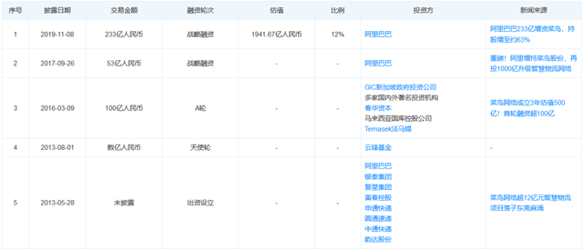 菜鸟融资历程 图源天眼查