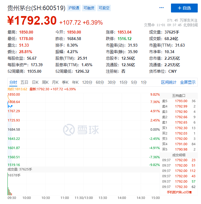 11月1日上午开盘,备受关注的贵州茅台跳空高开,暴涨9.82%,股价直接来到1850元/股,总市值暴涨2000多亿,升至2.32万亿。开盘后贵州茅台涨幅有所回调,截至发稿仍维持高位,总市值达2.25万亿元,市值增加1300亿左右。
