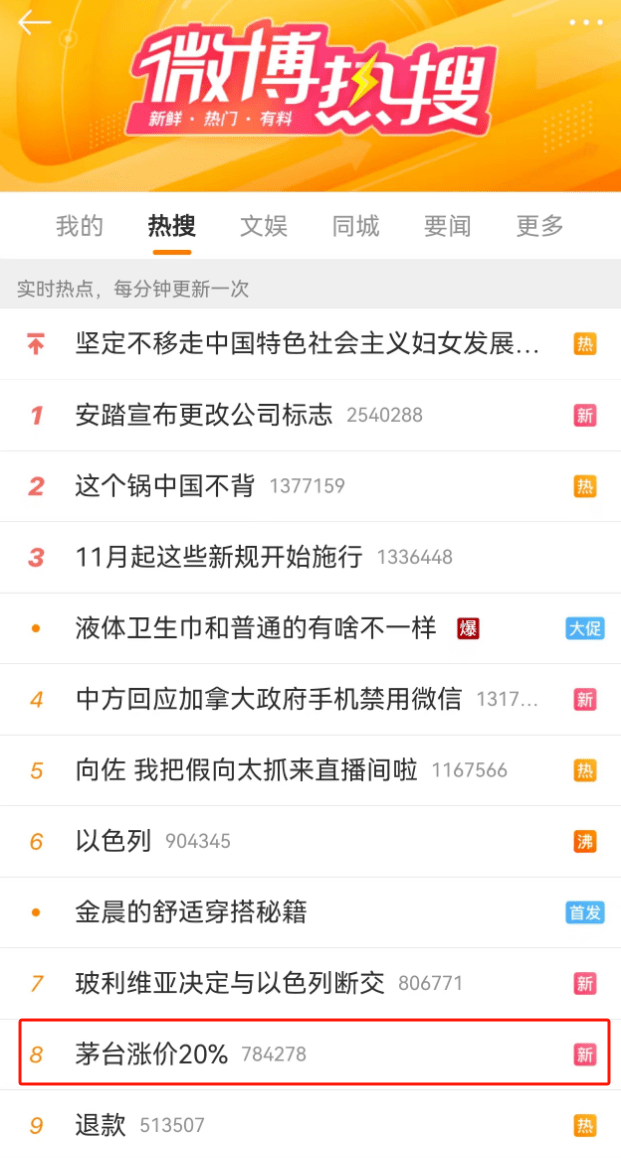 虽然消息在深夜发布,但仍引起市场热烈反应。茅台涨价20%#的词条也登上热搜榜。回顾来看,贵州茅台上一次涨价还要追溯至2018年1月1日,彼时茅台酒的出厂价格提高至969元/瓶,官方市场指导价为1499元/瓶。
