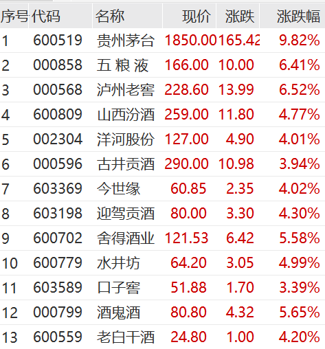 在贵州茅台带动下,白酒指数开盘涨5%,伊力特、泉阳泉先后触及涨停板,五粮液、泸州老窖、山西汾酒、洋河股份等接连走高。