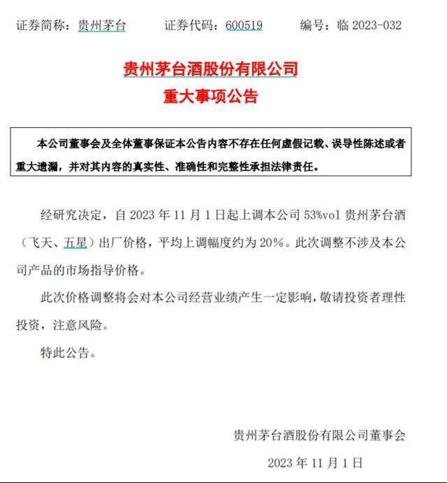 一位经销商表示,以53度500mL飞天茅台酒为例,其出厂价将由969元/瓶上调至1169元/瓶。