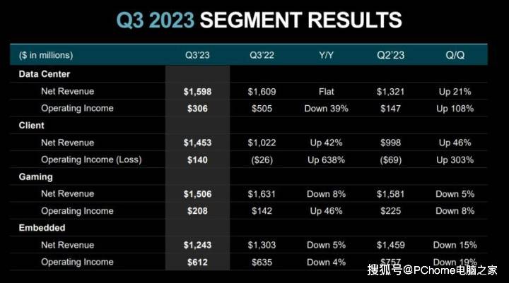 从业务划分来看,数据中心部门营收为16亿美元,与去年同期持平,环比增长2%,EPYC处理器部分的销售增长被SoC数据中心产品销售下降所抵消。针对消费产品的客户事业部营收为15亿美元,同比增长42%,环比增长46%,主要得益于锐龙处理器的销售增长。游戏事业部营收为15亿美元,同比下降8%,环比下降5%,主要原因是针对游戏机产品的半定制业务收入下降,部分被Radeon GPU的销售增长所抵消。嵌入式事业部营收为12亿美元,同比下降5%,环比下降15%,原因是通信市场收入减少,终端客户进行库存调整。