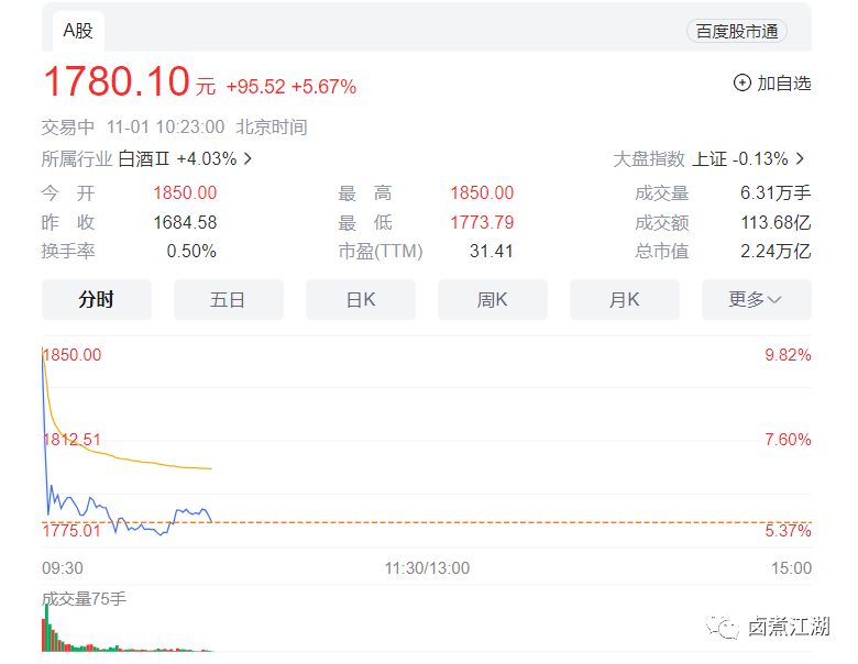 11月1日早盘集合竞价期间一度涨停,高开9.82%,而后有所回落,现涨近6%!
