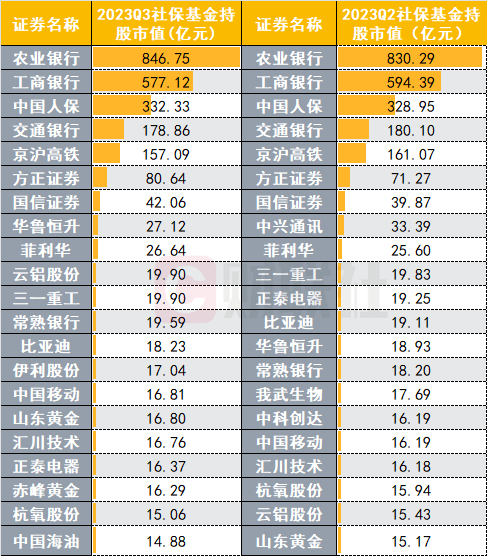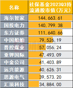 2023Q3社保基金新进持仓流通股市值居前的个股