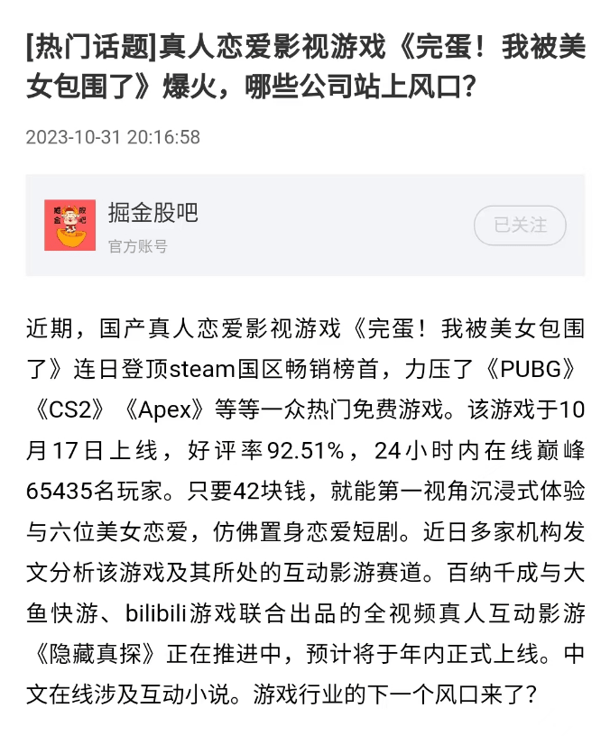 在昨日晚掘金股吧的热门话题中提到真人恋爱影视游戏《完蛋!我被美女包围了》爆火这个消息,相关公司百纳千成今天上午盘中20CM涨停,带动了整个游戏板块上涨。