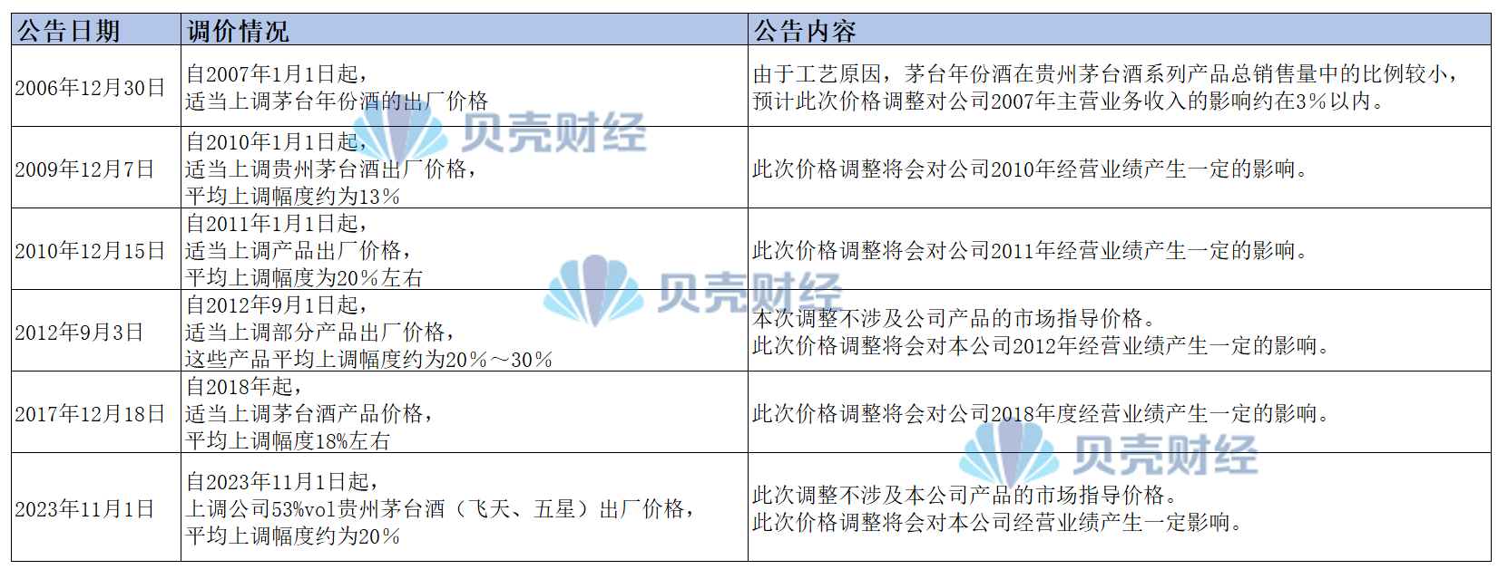 近年来,贵州茅台已经多次提价。贝壳财经记者以“价格调整”为关键词在贵州茅台公告中进行检索,共发现6条调价信息。自2007年起,包括本次调价在内,贵州茅台已经至少提价6次,涨价幅度为13%-30%。