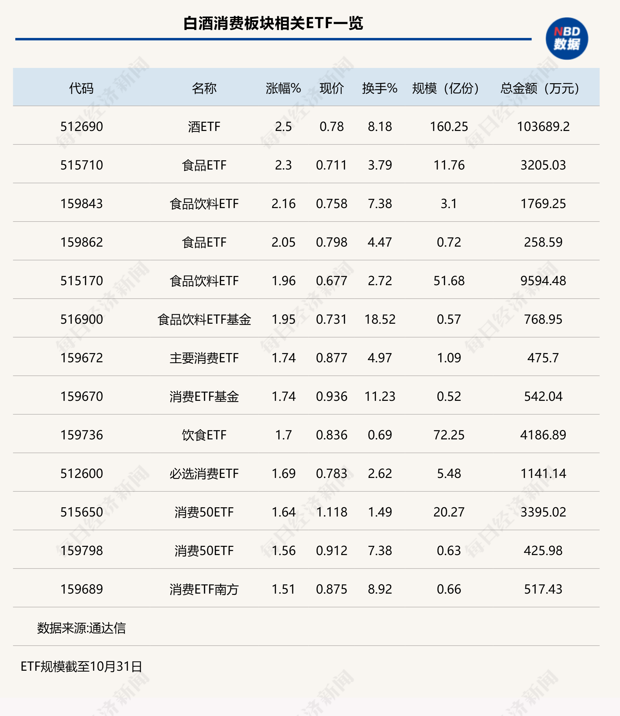 今日上午,酒ETF领涨整个ETF市场,半日涨幅达到2.5%,而与酒相关的食品饮料、消费类ETF也有不同程度上涨。其中,除了酒ETF外,食品饮料ETF与酒关联度最高,同样有较大的涨幅。