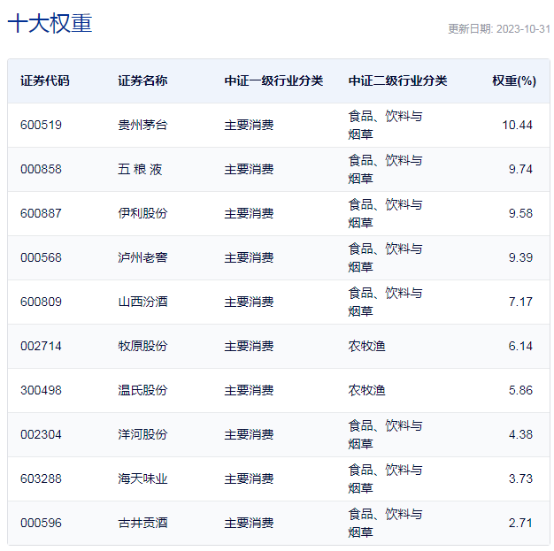 中证细分食品饮料产业主题指数涵盖沪深食品制造等行业相关细分产业公司,涉及白酒、调味发酵品、乳品、啤酒、保健品、软饮料、烘焙食品等多个行业,其中,白酒权重保持在60%左右。其前十大成分股权重合计超70%,呈现高集中度特点。