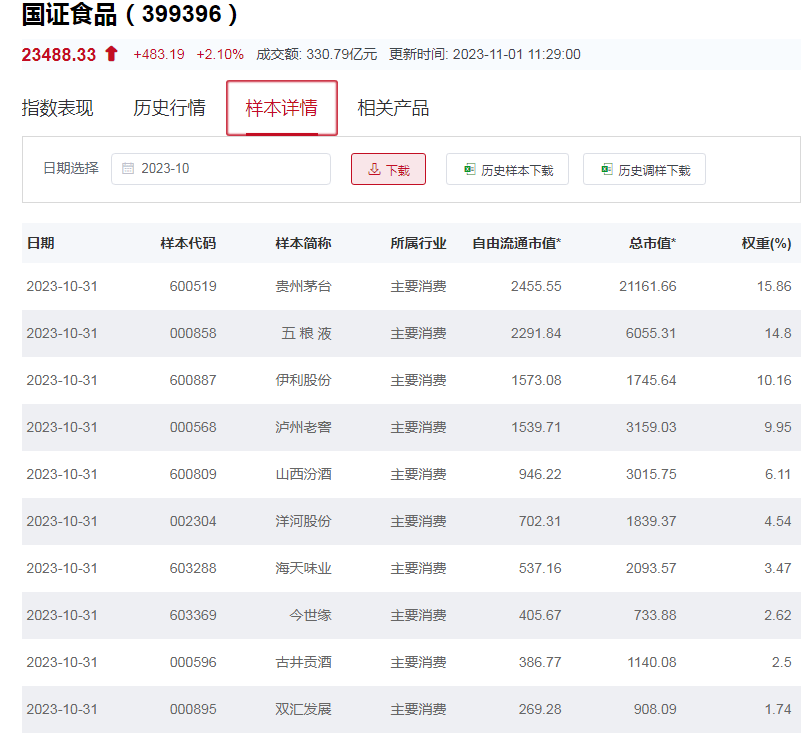 国证食品饮料行业指数于2012年10月29日由国证指数发布,选取国证行业分类标准下食品和饮料两个三级行业的沪深A股作为样本,采用自由流通市值加权。该指数在白酒行业权重占比过半,在调味发酵品、乳品行业亦有一定侧重。