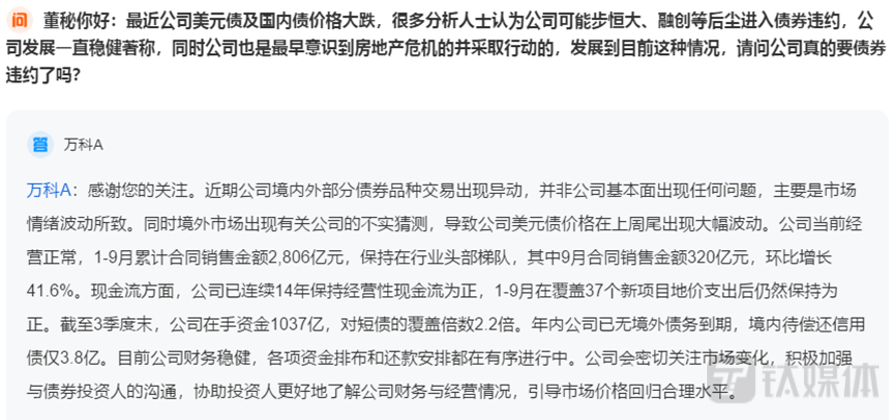 万科投资者互动交流平台上,有投资者这样提问:最近公司美元债及国内债价格大跌,很多分析人士认为公司可能步恒大、融创等后尘进入债券违约,公司发展一直稳健著称,同时公司也是最早意识到房地产危机并采取行动的,发展到目前这种情况,请问公司真的要债券违约了吗?