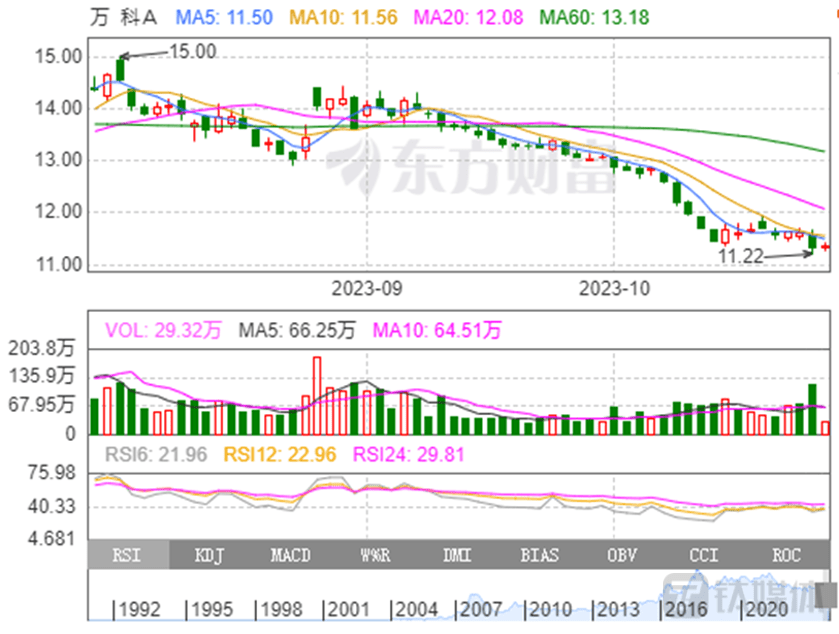 截至10月31日,万科A盘中股价下探至11.22元/股,收盘价为11.33元/股,今年以来已下跌32.95%,创下了2014年12月以来的新低。截止11月1日午间收盘价为11.32元/股。
