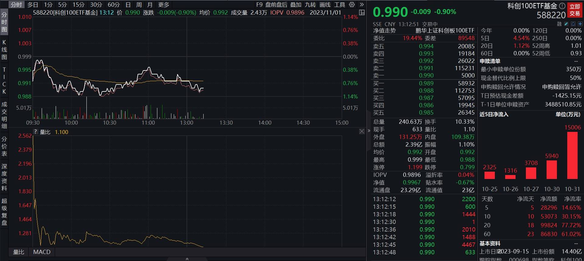 截至2023年11月1日13:12,科创100ETF基金(588220)午后开盘回调0.90%,成交额达2.39亿元,盘中委比近20%,买盘活跃,换手率超10%,资金布局意愿显著。Wind数据显示,该基金近20日累计“吸金”约10亿元。