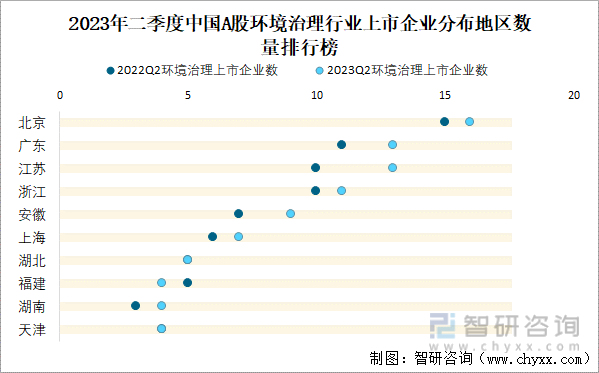 2023年二季度中国A股环境治理行业上市企业分布地区数量排行榜