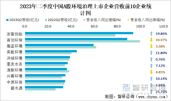 2023年二季度中国A股环境治理上市企业营收前10企业统计图