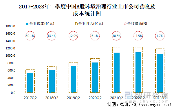 2017-2023年二季度中国A股环境治理行业上市公司营收及成本统计图