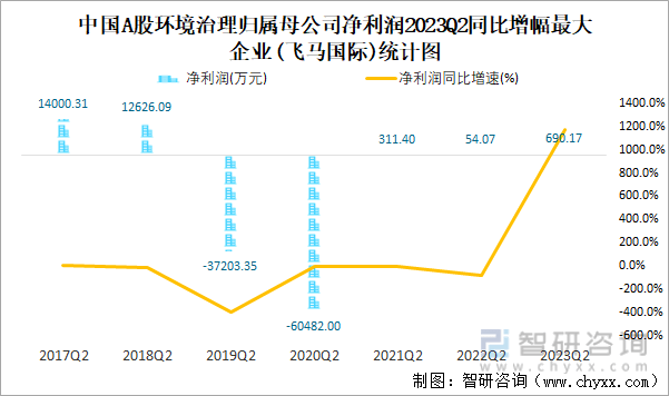 中国A股环境治理归属母公司净利润2023Q2同比增幅最大企业(飞马国际)统计图