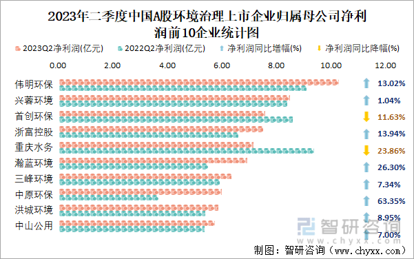 2023年二季度中国A股环境治理上市企业归属母公司净利润前10企业统计图