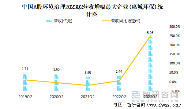 中国A股环境治理2023Q2营收增幅最大企业(惠城环保)统计图