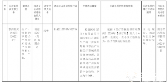 同年10月28日,其旗下另一子公司稳健医疗(黄冈)因在2021年11月20日生产的一批医用外科口罩不合格,被湖北药监局予以了责令改正并罚款的行政处罚。