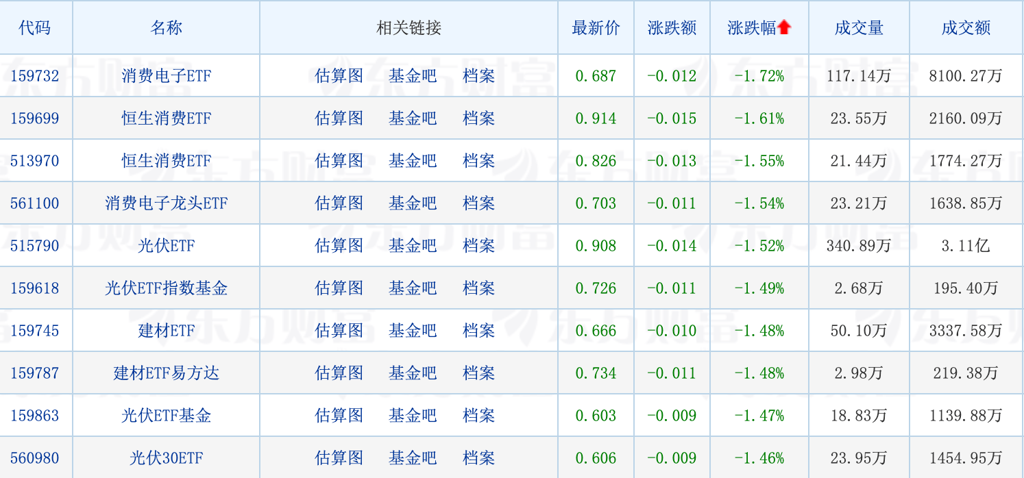 下跌方面,光伏、电子化学品板块领跌。受此影响,消费电子ETF领跌市场,最高下跌1.72%。此外,多只光伏ETF进入跌幅榜前列。