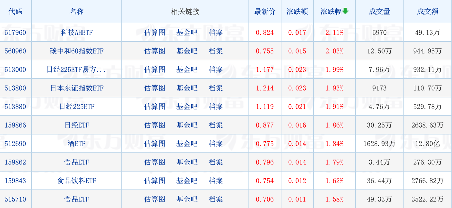 具体来看,亚太主要股市集体收涨,日经225指数涨2.41%,带动日经225相关ETF领涨,最高涨1.99%。A股方面,白酒股高开回落,贵州茅台涨超5%,食品饮料相关ETF走强。