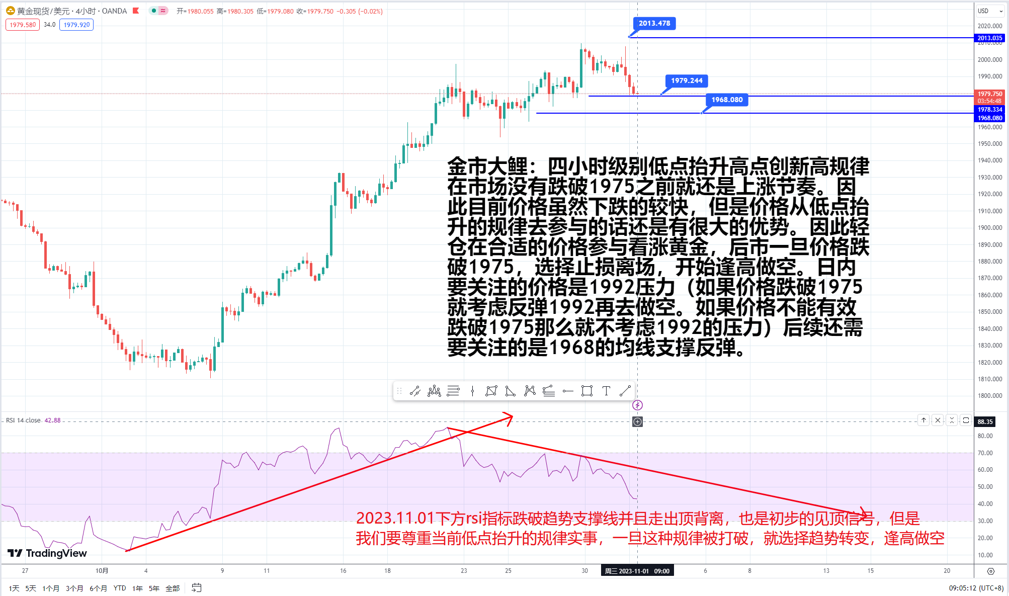 四小时级别低点抬升高点创新高规律在市场没有跌破1975之前就还是上涨节奏。因此目前价格虽然下跌的较快,但是价格从低点抬升的规律去参与的话还是有很大的优势。因此轻仓在合适的价格参与看涨黄金,后市一旦价格跌破1975,选择止损离场,开始逢高做空。日内要关注的价格是1992压力(如果价格跌破1975就考虑反弹1992再去做空。如果价格不能有效跌破1975那么就不考虑1992的压力)后续还需要关注的是1968的均线支撑反弹。