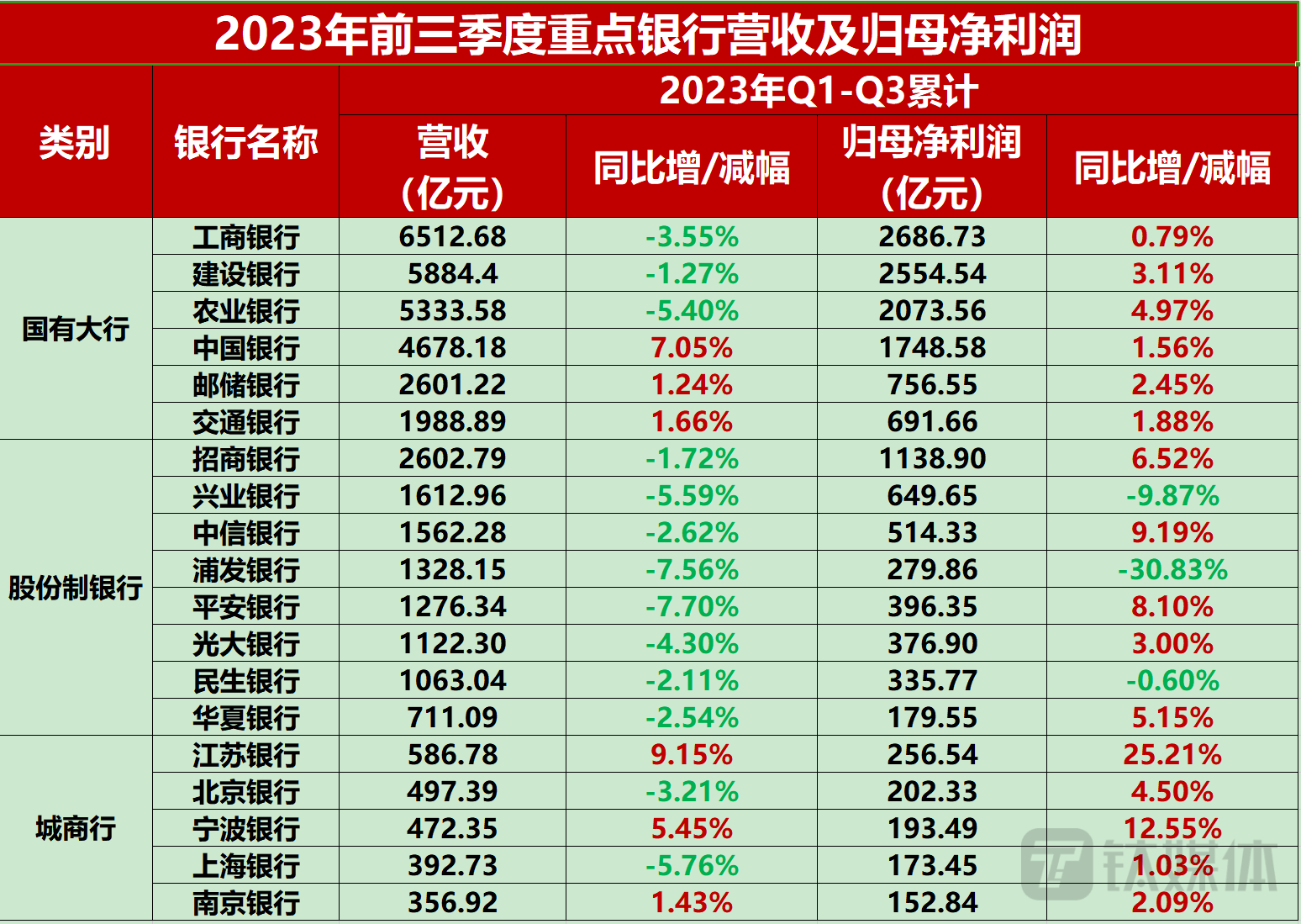统计表明,从营收看,国有大行和城商行有增有降,股份制银行集体下降;从归母净利润看,国有大行和城商行集体增长,股份制银行有增有降。