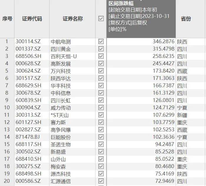 黄桷树财经注意到,在整个西部地区,有14只股票的涨幅超过了100%,其中陕西的中航电测以346.29%的涨幅位居西部第一位,紧随其后的是四川黄金和百利天恒-U,涨幅分别为315.48%、258.62%。