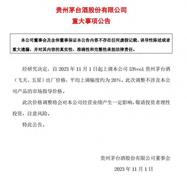 10月31日晚间,贵州茅台酒股份有限公司发布公告称,经研究决定,自2023年11月1日起上调本公司53%vol贵州茅台酒(飞天、五星)出厂价格,平均上调幅度约为20%。此次调整不涉及本公司产品的市场指导价格。